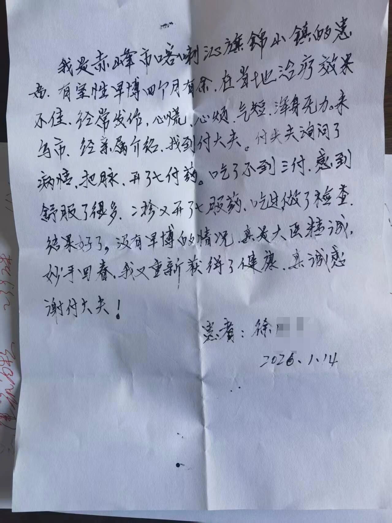 1月14日,乌兰浩特市医共体总医院都林社区分院一楼专家诊室内暖意涌动。来自赤峰市的60余岁患者徐某手捧情真意切的感谢信,向市医共体总医院派驻专家、中医主任医师付仁革深深鞠躬致谢。这封承载着全家感激的信件,不仅定格了跨越800公里的医患深情,更生动彰显了乌兰浩特市医共体总医院优质医疗资源下沉基层的丰硕成果。
